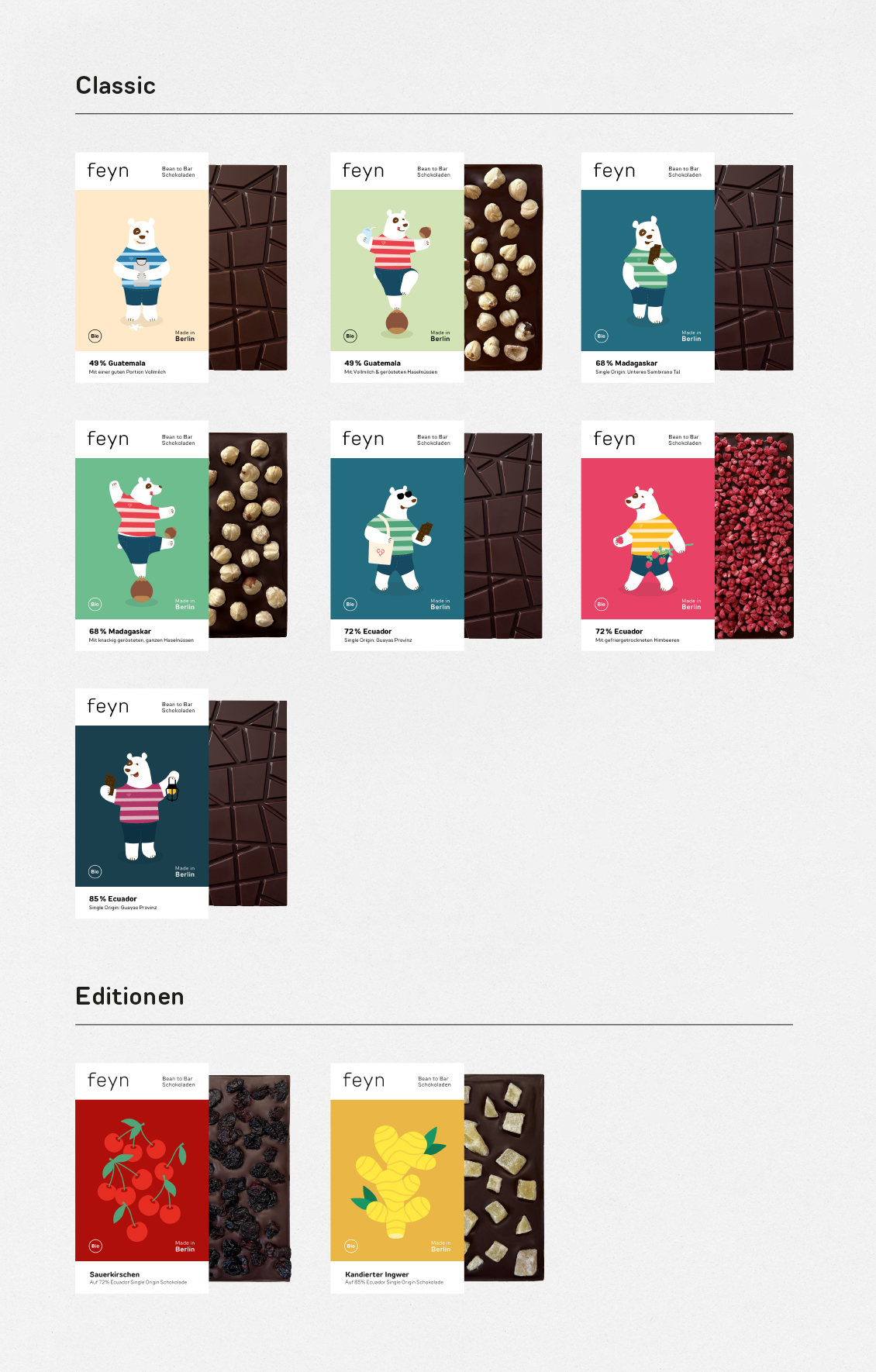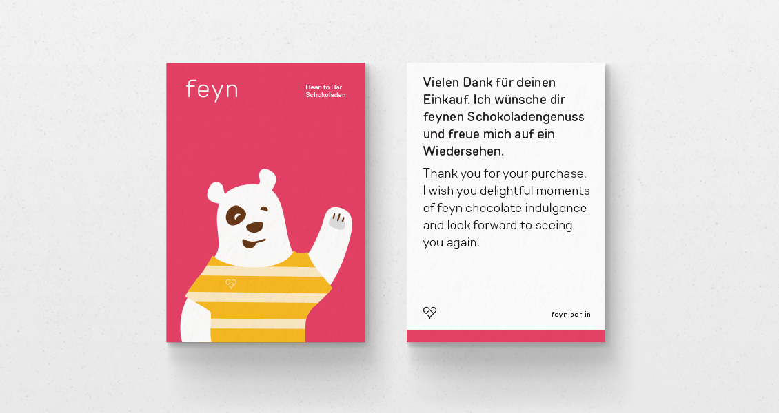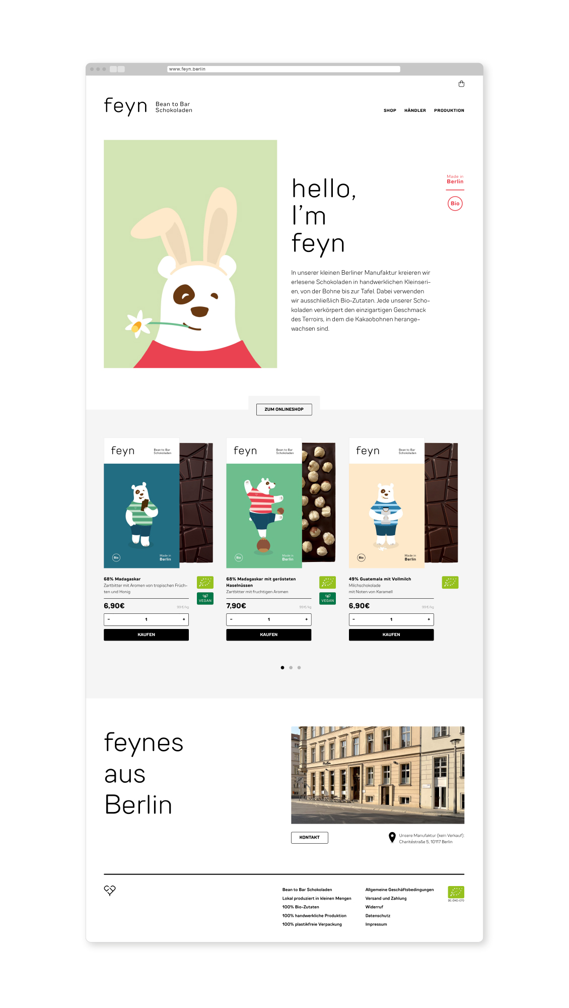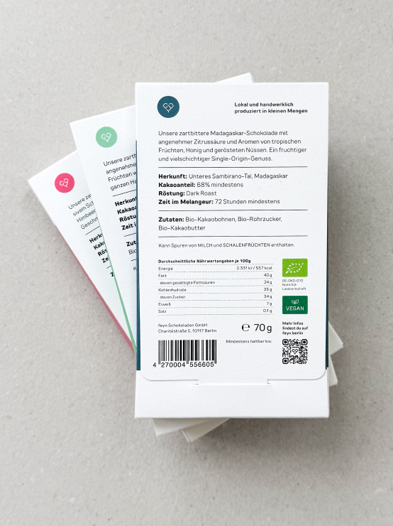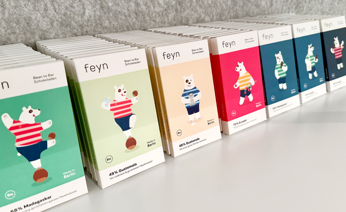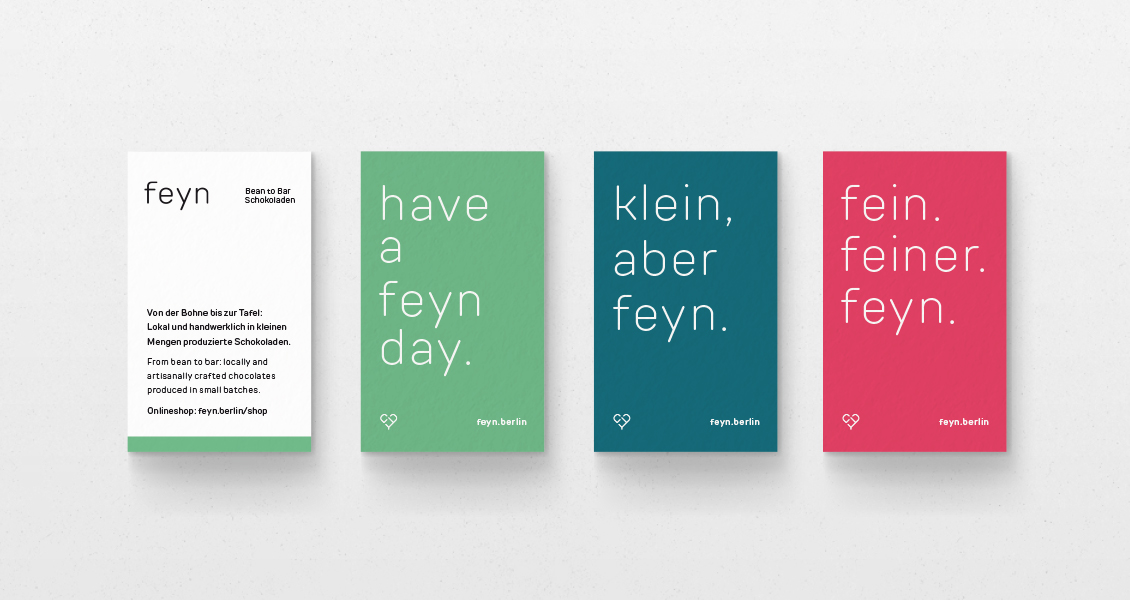 Development of a holistic brand presence for feyn Bean-to-Bar Chocolate – from strategic brand profiling and name development to a consistent visual identity. The corporate design defines all central design elements and brand touchpoints, including logo, color palette, typography, illustration system, packaging design, website, text tone, and the design of the customer journey across all contact phases.